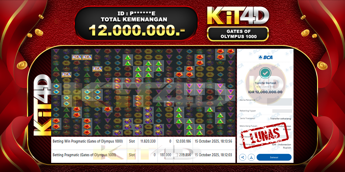 KIT4D – Selamat kepada Pemenang User ID : P******E JP GATES OF OLYMPUS 1000 Rp 12.000.000 pada 15 Oktober 2025 – Bermain di situs game online terpercaya KIT4D yang telah terbukti dengan Bukti JP KIT4D resmi dan terjamin di Indonesia adalah pilihan tepat bagi para pecinta game online. Kemenangan spektakuler senilai Rp 12.000.000 yang diraih oleh User ID : P******E dalam permainan JP GATES OF OLYMPUS 1000 semakin memperkuat reputasi KIT4D sebagai platform yang aman, transparan, dan memberikan peluang menang besar bagi semua pemain.