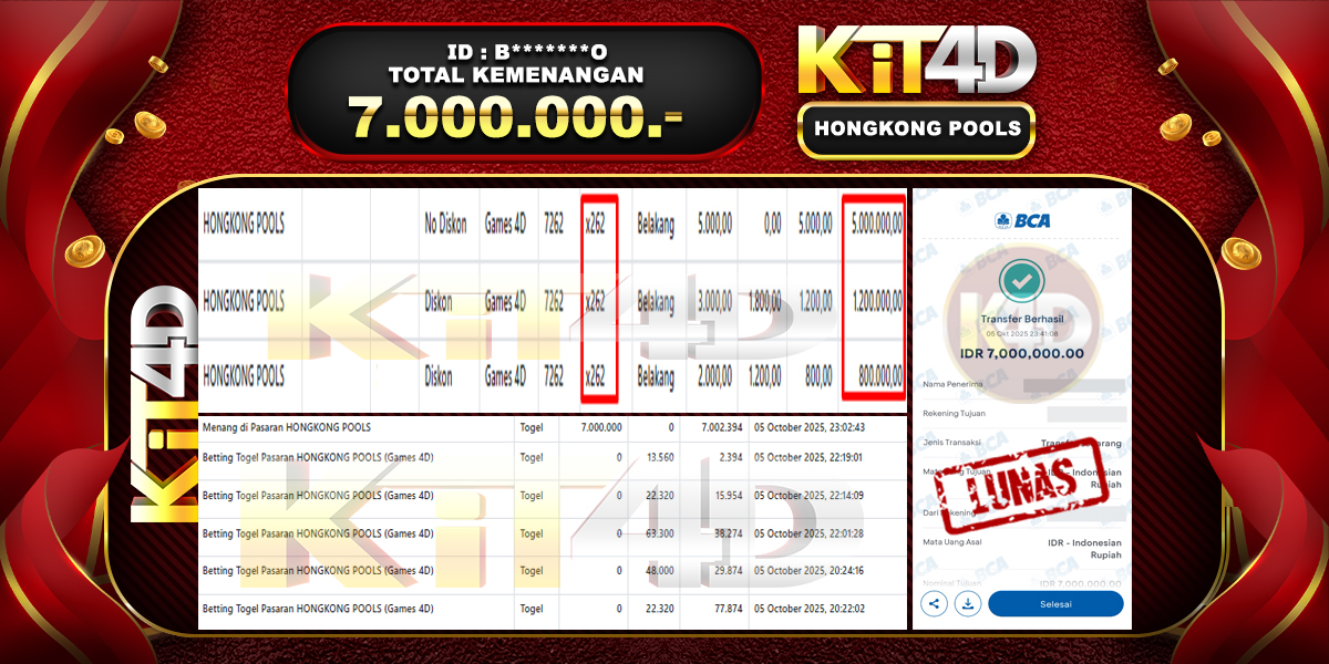 KIT4D – Selamat kepada Pemenang User ID : B*******O JP HONGKONG POOLS Rp 7.000.000 pada 05 Oktober 2025 – Bermain di situs game online terpercaya KIT4D yang telah terbukti dengan Bukti JP KIT4D resmi dan terjamin di Indonesia adalah pilihan tepat bagi para pecinta game online. Kemenangan spektakuler senilai Rp 7.000.000 yang diraih oleh User ID : B*******O dalam permainan JP HONGKONG POOLS semakin memperkuat reputasi KIT4D sebagai platform yang aman, transparan, dan memberikan peluang menang besar bagi semua pemain.