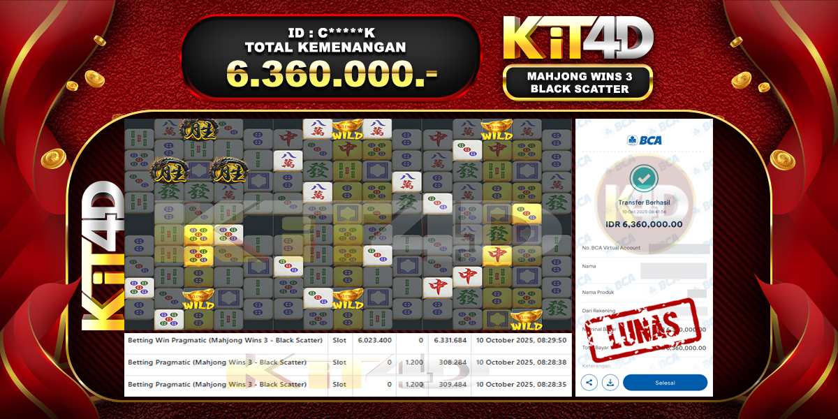 KIT4D – Selamat kepada Pemenang User ID : C*****K JP MAHJONG WINS 3 BLACK SCATTER Rp 6.360.000 pada 10 Oktober 2025 –  Bermain di situs game online terpercaya KIT4D yang telah terbukti dengan Bukti JP KIT4D resmi dan terjamin di Indonesia adalah pilihan tepat bagi para pecinta game online. Kemenangan spektakuler senilai Rp 6.360.000 yang diraih oleh User ID : C*****K dalam permainan JP MAHJONG WINS 3 BLACK SCATTER semakin memperkuat reputasi KIT4D sebagai platform yang aman, transparan, dan memberikan peluang menang besar bagi semua pemain.