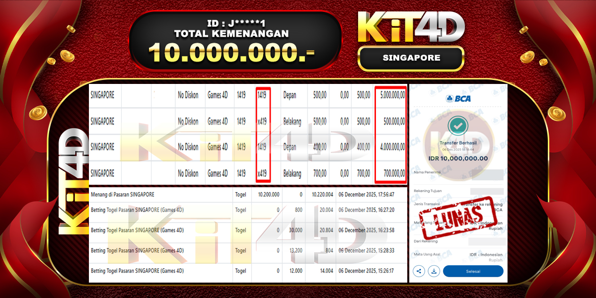 KIT4D – Selamat kepada Pemenang User ID : J*****1 JP SINGAPORE Rp 10.000.000 pada 06 Desember 2025 – Bermain di situs game online terpercaya KIT4D yang telah terbukti dengan Bukti JP KIT4D resmi dan terjamin di Indonesia adalah pilihan tepat bagi para pecinta game online. Kemenangan spektakuler senilai Rp 10.000.000 yang diraih oleh User ID : J*****1 dalam permainan JP SINGAPORE semakin memperkuat reputasi KIT4D sebagai platform yang aman, transparan, dan memberikan peluang menang besar bagi semua pemain.