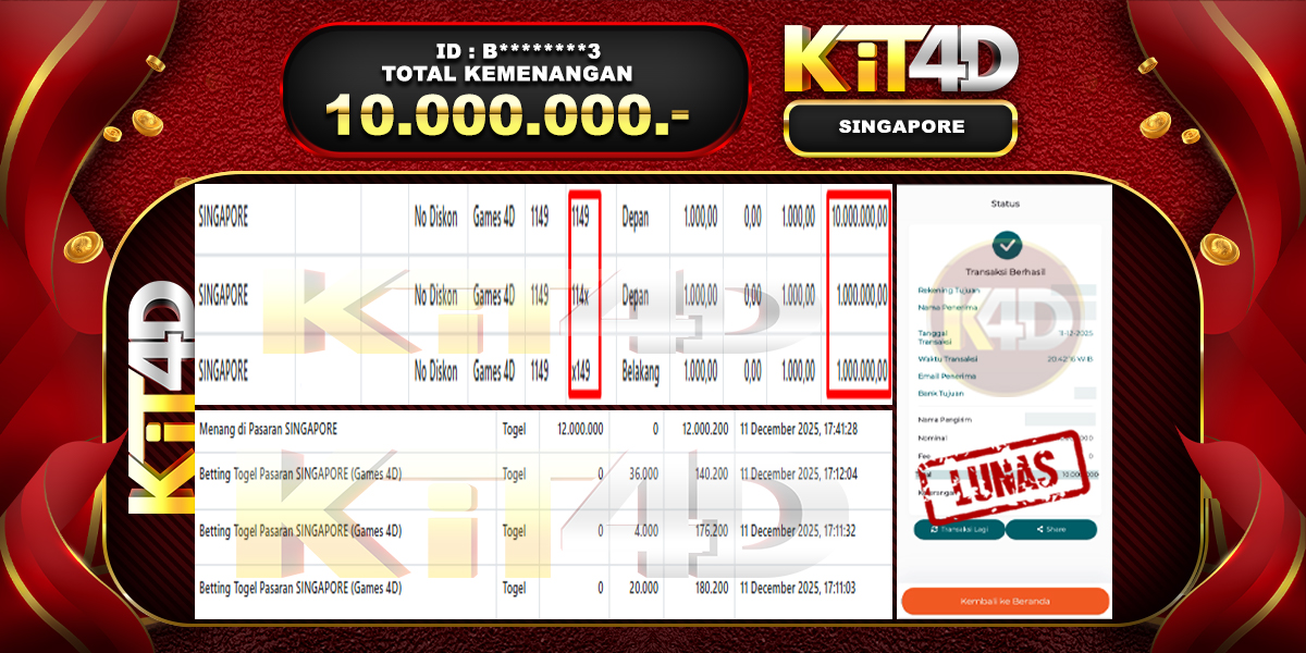 KIT4D – Selamat kepada Pemenang User ID : B********3  JP SINGAPORE Rp 10.000.000 pada 11 Desember 2025 –  Bermain di situs game online terpercaya KIT4D yang telah terbukti dengan Bukti JP KIT4D resmi dan terjamin di Indonesia adalah pilihan tepat bagi para pecinta game online. Kemenangan spektakuler senilai Rp 10.000.000 yang diraih oleh User ID : B********3 dalam permainan JP SINGAPORE semakin memperkuat reputasi KIT4D sebagai platform yang aman, transparan, dan memberikan peluang menang besar bagi semua pemain.