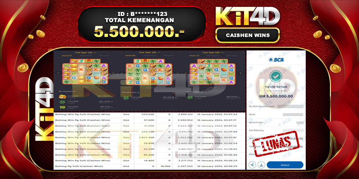 KIT4D – Selamat kepada Pemenang User ID : B*******123 JP CAISHEN WINS Rp 5.500.000 pada 16 Januari 2026 – Bermain di situs game online terpercaya KIT4D yang telah terbukti dengan Bukti JP KIT4D resmi dan terjamin di Indonesia adalah pilihan tepat bagi para pecinta game online. Kemenangan spektakuler senilai Rp 5.500.000 yang diraih oleh User ID : B*******123 dalam permainan JP CAISHEN WINS semakin memperkuat reputasi KIT4D sebagai platform yang aman, transparan, dan memberikan peluang menang besar bagi semua pemain.