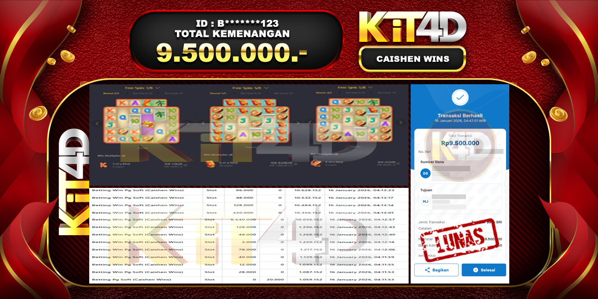 KIT4D – Selamat kepada Pemenang User ID : B*******123 JP CAISHEN WINS Rp 9.500.000 pada 16 Januari 2026 –  Bermain di situs game online terpercaya KIT4D yang telah terbukti dengan Bukti JP KIT4D resmi dan terjamin di Indonesia adalah pilihan tepat bagi para pecinta game online. Kemenangan spektakuler senilai Rp 9.500.000 yang diraih oleh User ID : B*******123 dalam permainan JP CAISHEN WINS semakin memperkuat reputasi KIT4D sebagai platform yang aman, transparan, dan memberikan peluang menang besar bagi semua pemain.