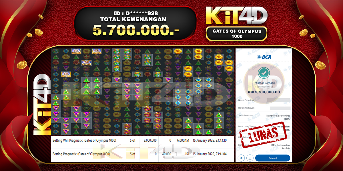 KIT4D – Selamat kepada Pemenang User ID : D******928 JP GATES OF OLYMPUS 1000 Rp 5.700.000 pada 15 Januari 2026 –  Bermain di situs game online terpercaya KIT4D yang telah terbukti dengan Bukti JP KIT4D resmi dan terjamin di Indonesia adalah pilihan tepat bagi para pecinta game online. Kemenangan spektakuler senilai Rp 5.700.000 yang diraih oleh User ID : D******928 dalam permainan JP GATES OF OLYMPUS 1000 semakin memperkuat reputasi KIT4D sebagai platform yang aman, transparan, dan memberikan peluang menang besar bagi semua pemain.