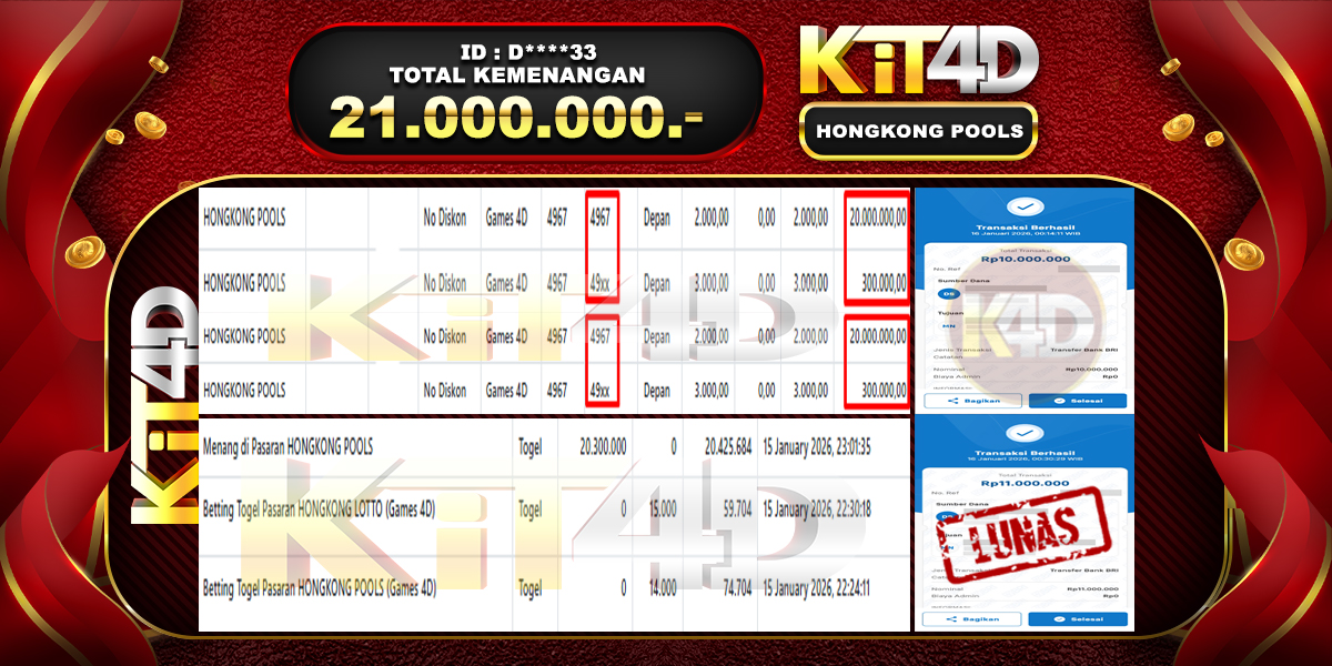 KIT4D – Selamat kepada Pemenang User ID : D****33 JP HONGKONG POOLS Rp 21.000.000 pada 15 Januari 2026 – Bermain di situs game online terpercaya KIT4D yang telah terbukti dengan Bukti JP KIT4D resmi dan terjamin di Indonesia adalah pilihan tepat bagi para pecinta game online. Kemenangan spektakuler senilai Rp 21.000.000 yang diraih oleh User ID : D****33 dalam permainan JP HONGKONG POOLS semakin memperkuat reputasi KIT4D sebagai platform yang aman, transparan, dan memberikan peluang menang besar bagi semua pemain.