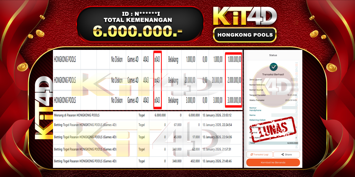 KIT4D – Selamat kepada Pemenang User ID : N******I JP HONGKONG POOLS Rp 6.000.000 pada 13 Januari 2026 – Bermain di situs game online terpercaya KIT4D yang telah terbukti dengan Bukti JP KIT4D resmi dan terjamin di Indonesia adalah pilihan tepat bagi para pecinta game online. Kemenangan spektakuler senilai Rp 6.000.000 yang diraih oleh User ID : N******I dalam permainan JP HONGKONG POOLS semakin memperkuat reputasi KIT4D sebagai platform yang aman, transparan, dan memberikan peluang menang besar bagi semua pemain.