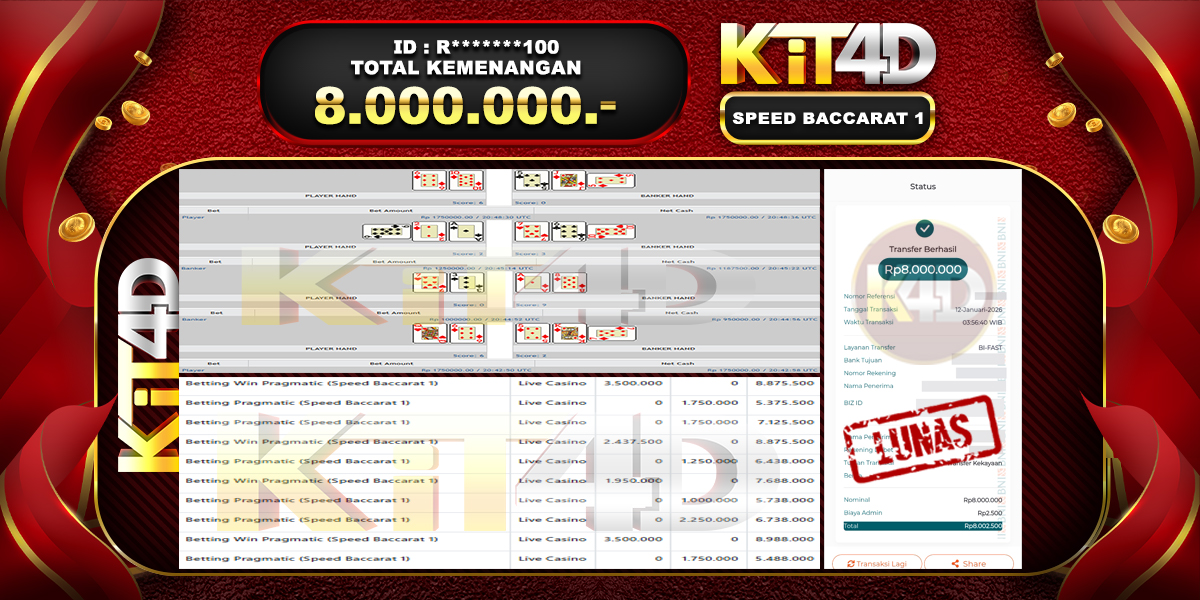 KIT4D – Selamat kepada Pemenang User ID : R*******100 JP SPEED BACCARAT 1 Rp 8.000.000 pada 12 Januari 2026 – Bermain di situs game online terpercaya KIT4D yang telah terbukti dengan Bukti JP KIT4D resmi dan terjamin di Indonesia adalah pilihan tepat bagi para pecinta game online. Kemenangan spektakuler senilai Rp 8.000.000 yang diraih oleh User ID : R*******100 dalam permainan JP SPEED BACCARAT 1 semakin memperkuat reputasi KIT4D sebagai platform yang aman, transparan, dan memberikan peluang menang besar bagi semua pemain.