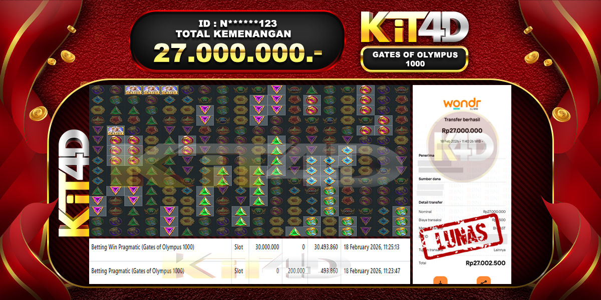 KIT4D – Selamat kepada Pemenang User ID : N******123 JP GATES OF OLYMPUS 1000 Rp 27.000.000 pada 18 February 2026 – Bermain di situs game online terpercaya KIT4D yang telah terbukti dengan Bukti JP KIT4D resmi dan terjamin di Indonesia adalah pilihan tepat bagi para pecinta game online. Kemenangan spektakuler senilai Rp 27.000.000 yang diraih oleh User ID : N******123 dalam permainan JP GATES OF OLYMPUS 1000 semakin memperkuat reputasi KIT4D sebagai platform yang aman, transparan, dan memberikan peluang menang besar bagi semua pemain.