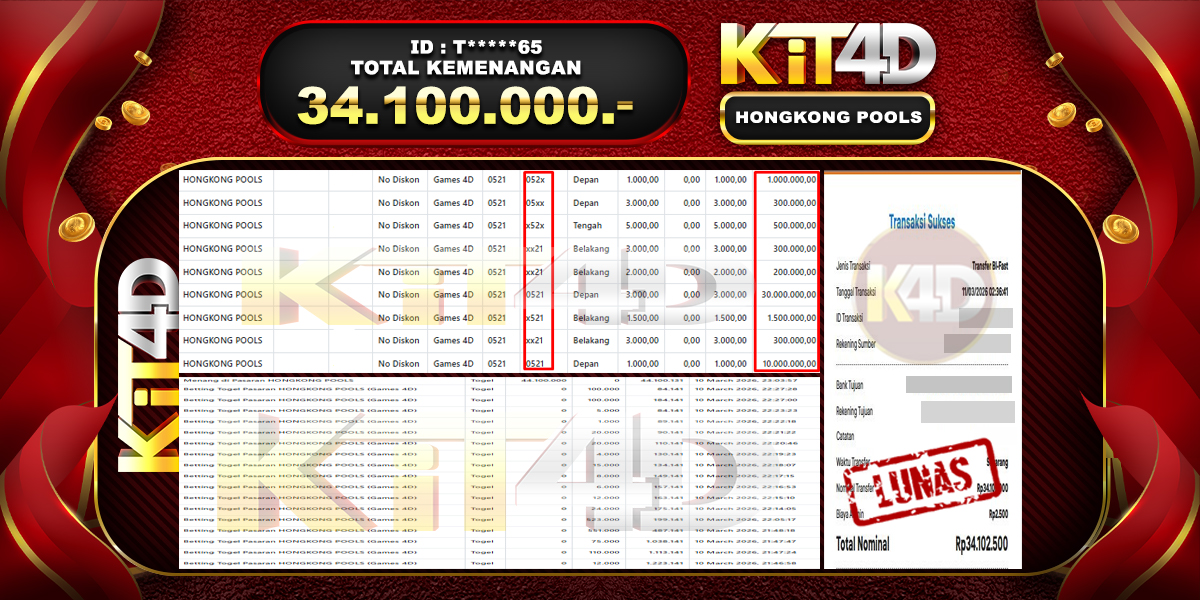 KIT4D – Selamat kepada Pemenang User ID : T*****65 JP HONGKONG POOLS Rp 34.100.000 pada 11 Maret 2026 –  Bermain di situs game online terpercaya KIT4D yang telah terbukti dengan Bukti JP KIT4D resmi dan terjamin di Indonesia adalah pilihan tepat bagi para pecinta game online. Kemenangan spektakuler senilai Rp 34.100.000 yang diraih oleh User ID : T*****65 dalam permainan JP HONGKONG POOLS semakin memperkuat reputasi KIT4D sebagai platform yang aman, transparan, dan memberikan peluang menang besar bagi semua pemain.