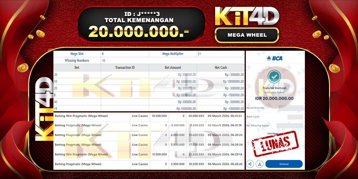 Kami turut merayakan kemenangan besar salah satu pemain setia KIT4D, yang berhasil membawa pulang hadiah senilai Rp 20.000.000 dalam permainan JP MEGA WHEEL pada 06 Maret 2026. Kemenangan ini telah diproses dan dibayar lunas langsung ke rekening terdaftar pemain tersebut. Semoga kemenangan ini menjadi inspirasi bagi para pemain lainnya untuk terus mencoba keberuntungan mereka dan merasakan pengalaman bermain yang aman, seru, dan menguntungkan di KIT4D. Jangan ragu untuk bergabung dan jadilah pemenang berikutnya!